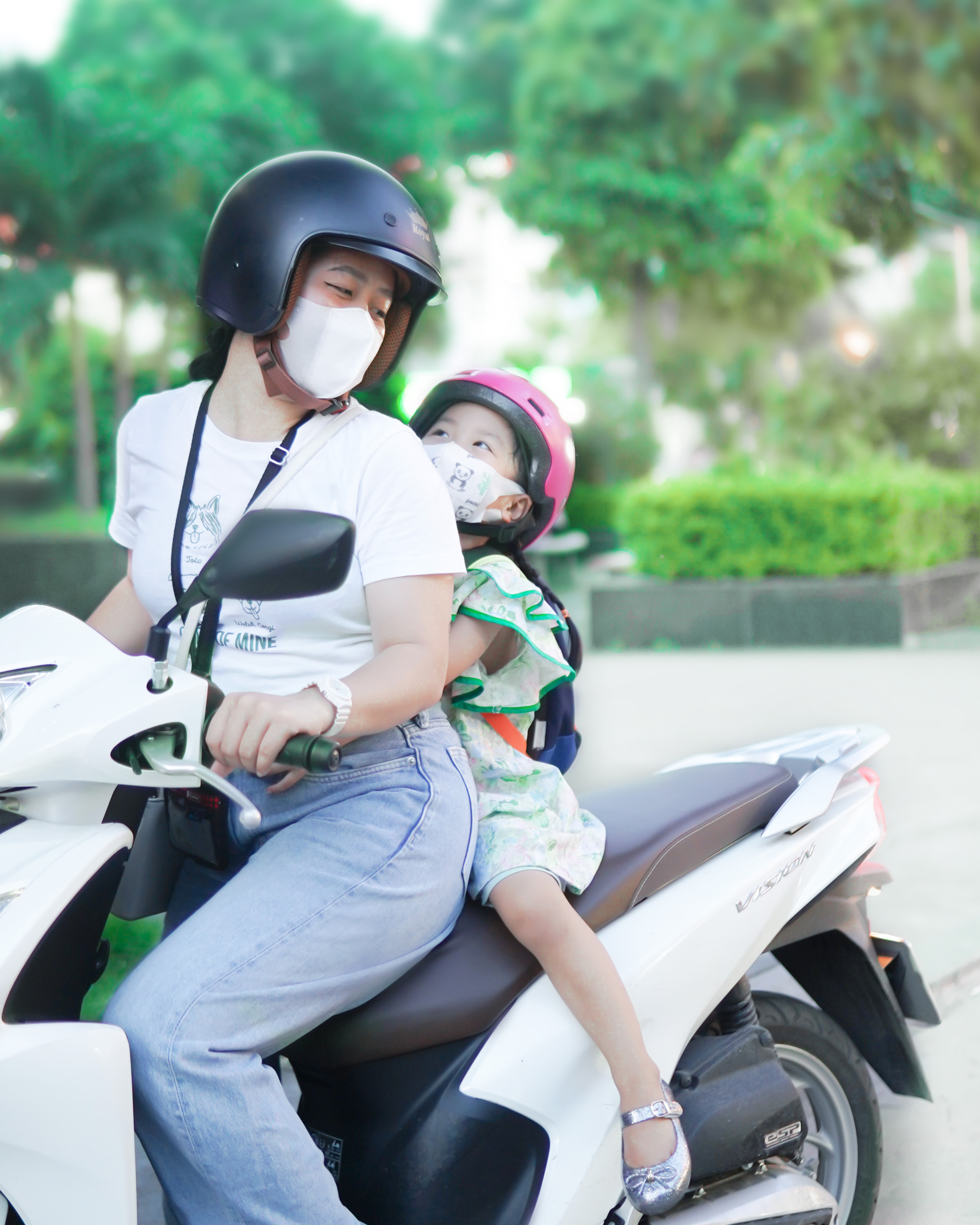 Hình ảnh quen thuộc của những bà mẹ có con nhỏ vào giờ tan tầm - cao điểm giao thông. Ảnh: Hà Phương