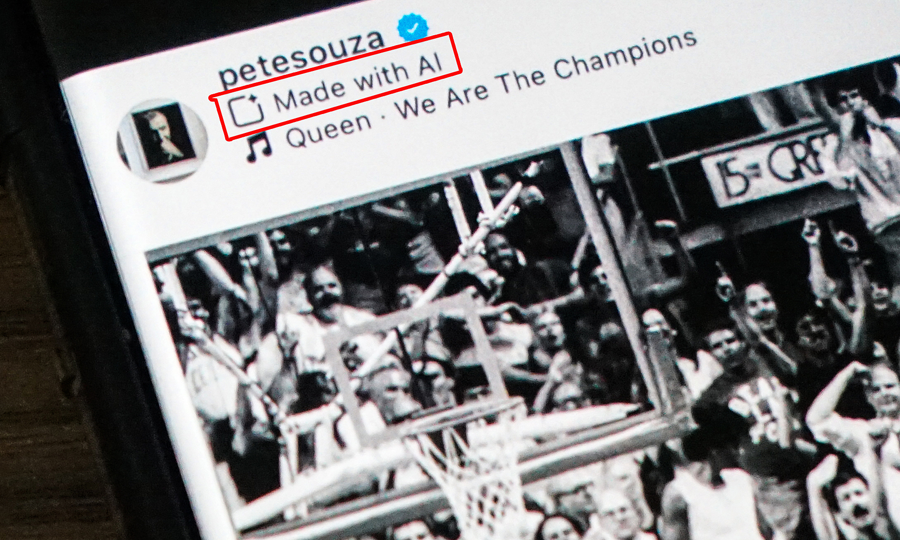 Bức ảnh của nhiếp ảnh gia Pete Souza bị dán nhãn "Made with AI" trên Instagram hiển thị trên smartphone. Ảnh: Bảo Lâm