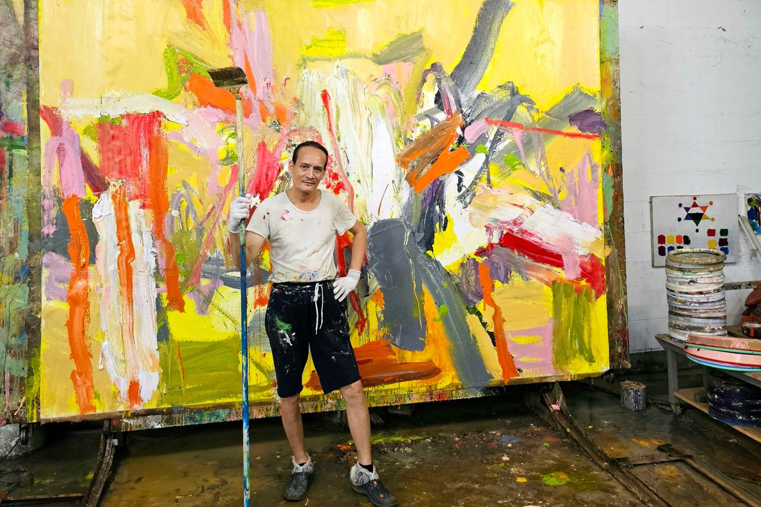 Trần Hải Minh vẽ tranh khổ lớn tại xưởng vẽ. Ảnh: Nhân vật cung cấp