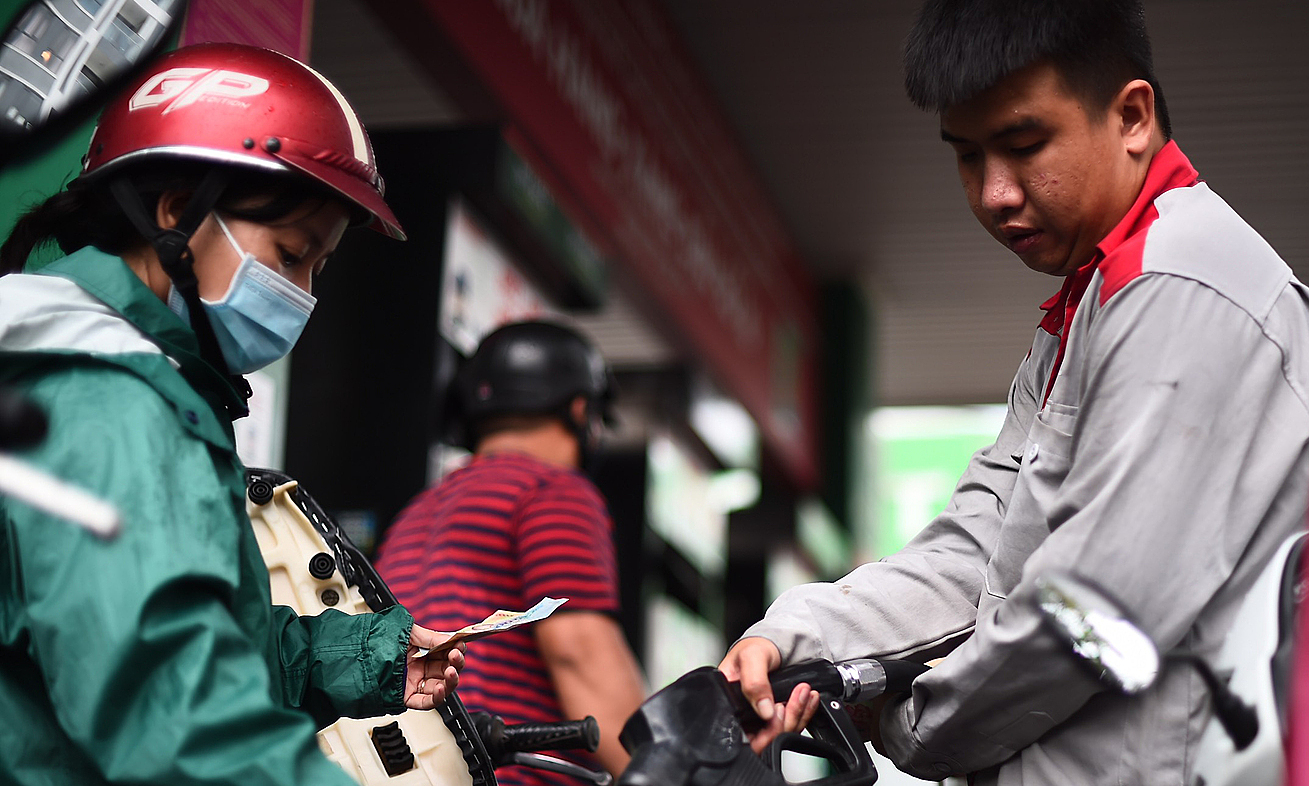 Nhân viên trạm xăng dầu trên trên đường Nguyễn Thị Định,TP Thủ Đức đang bơm xăng cho khách. Ảnh: Thanh Tùng