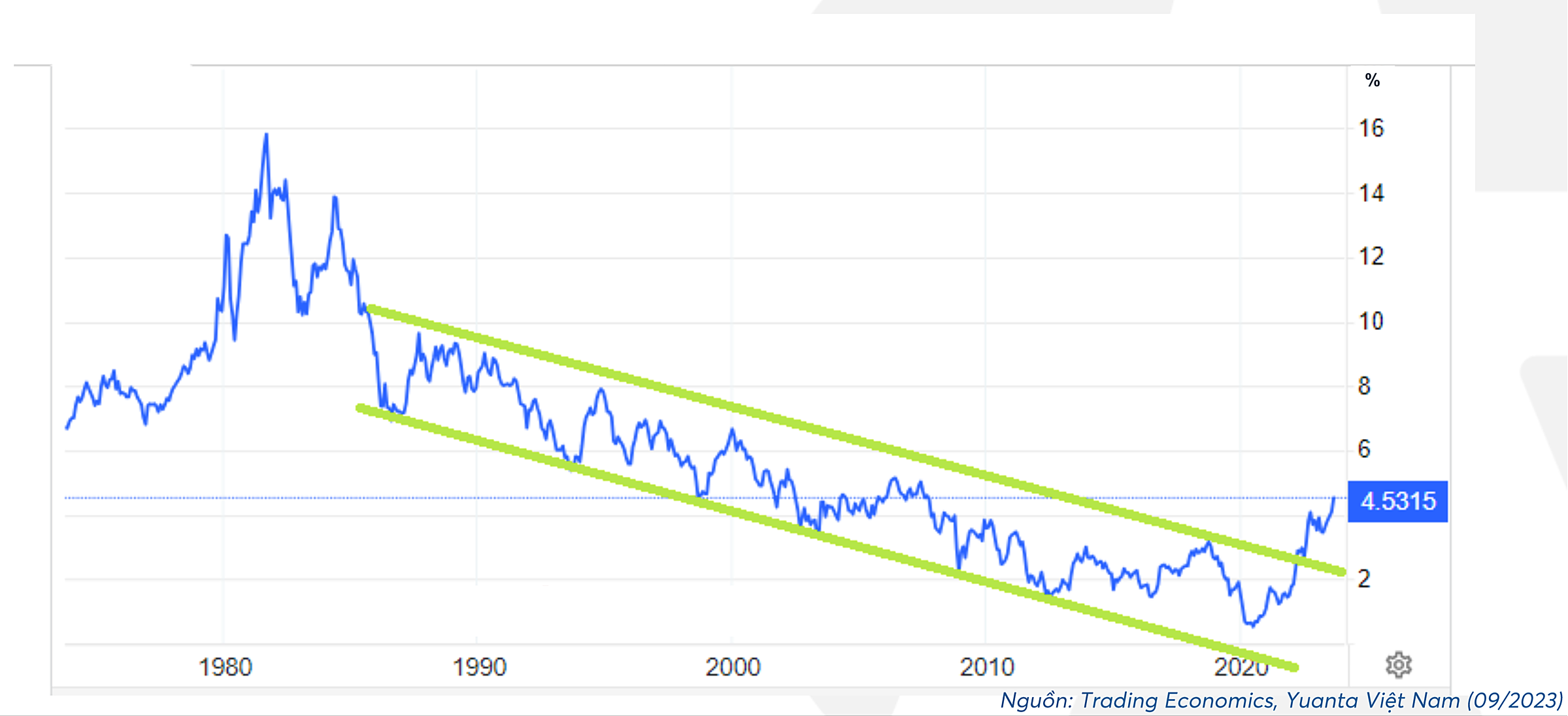 Lãi suất trái phiếu chính phủ Mỹ kỳ hạn 10 có xu hướng tăng trở lại từ năm 2020. Ảnh: Yuanta Việt Nam