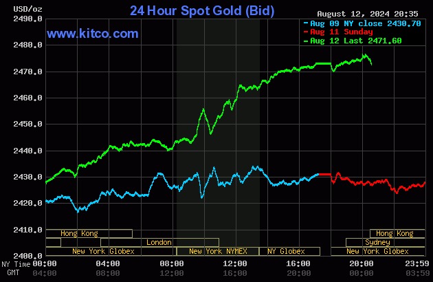 Chốt phiên giao dịch 12/8,giá vàng thế giới giao ngay tăng 42 USD,lên 2.472 USD một ounce. Đây là mức cao nhất kể từ đầu tháng.