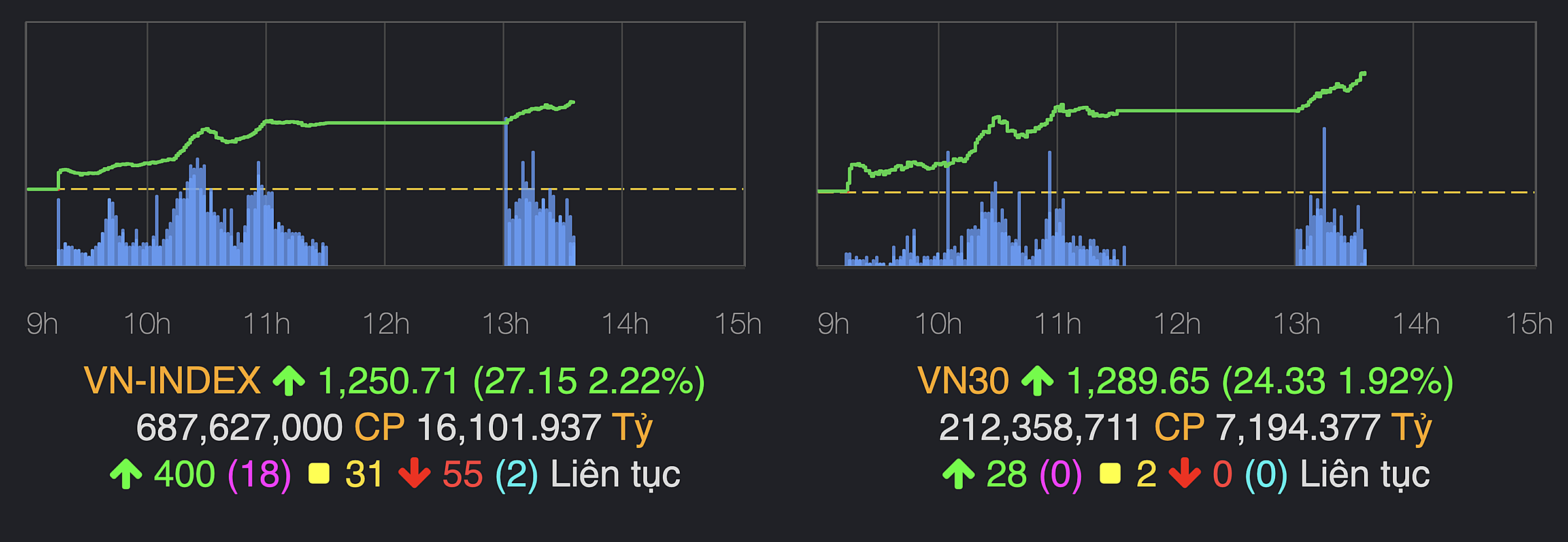 Chưa hết giờ giao dịch đầu buổi chiều,thanh khoản thị trường TP HCM cán mốc 15.000 tỷ đồng,cao hơn tổng giá trị giao dịch cả ngày trong 5 phiên trước đó. Nhà đầu tư bắt đầu giao dịch sôi nổi sau giai đoạn đứng ngoài thị trường quan sát. Khối ngoại cũng đồng thuận với tâm lý tích cực khi họ đang nghiêng về phía mua ròng.
