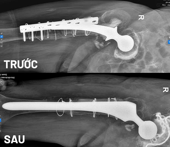 Êkíp quyết định ghép xương tái tạo khung chậu và đầu trên xương đùi,sau đó thay khớp háng. Phẫu thuật này phức tạp,thời gian kéo dài,nhưng bệnh nhân có thể tập phục hồi sớm,chi phí điều trị hợp lý.