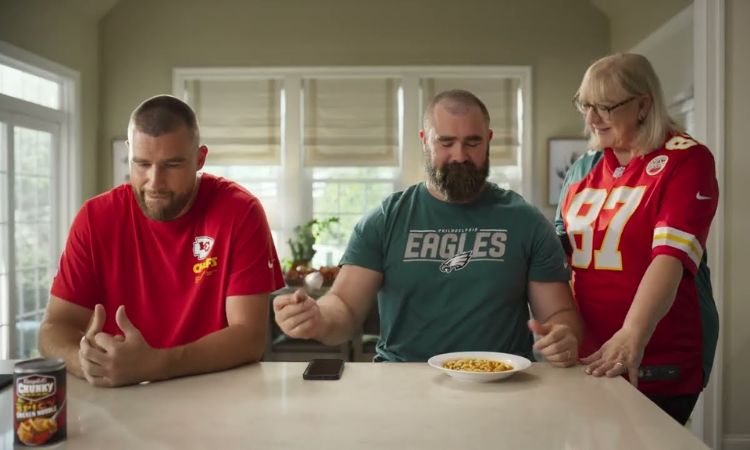 Travis Kelce (trái),anh trai Jason và mẹ trong quảng cáo của Campbell's Chunky. Video:YouTube Campbell's Chunky