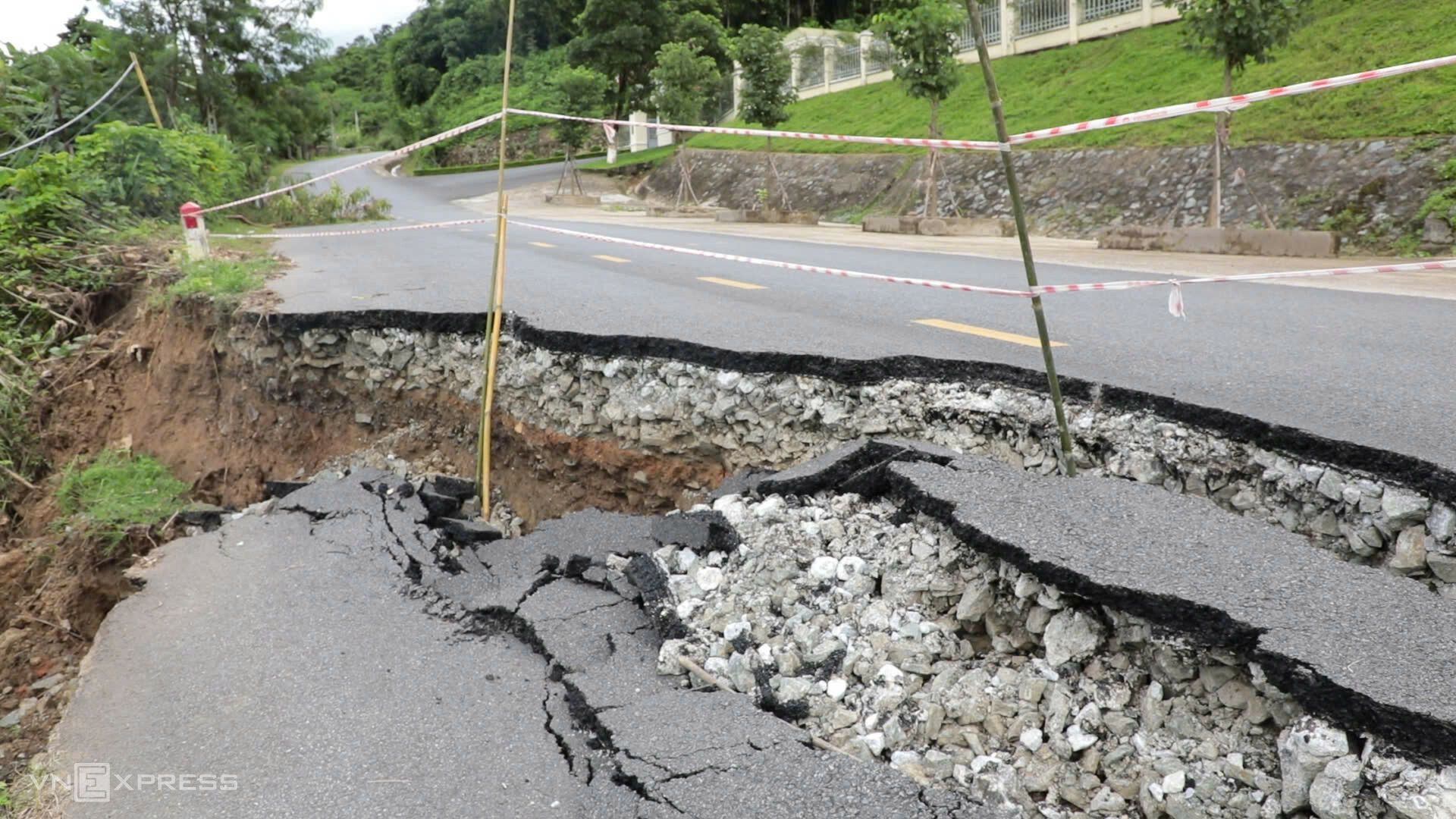 Quốc lộ 15C qua xã Pù Nhi nứt toác. Ảnh: Lam Sơn