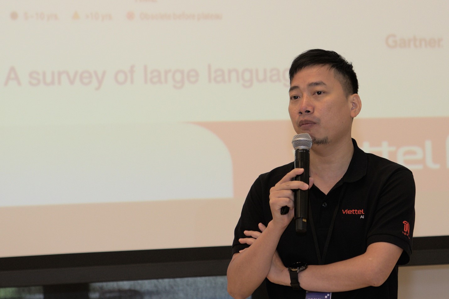 Trong khuôn khổ sự kiện,ông Nguyễn Hoàng Hưng,Giám đốc Công nghệ Viettel AI có bài tham luận trình bày quá trình phát triển nghiên cứu phát triển công nghệ mới tại tập đoàn,trong đó có mô hình ngôn ngữ lớn (LLM – Large Language Model).
