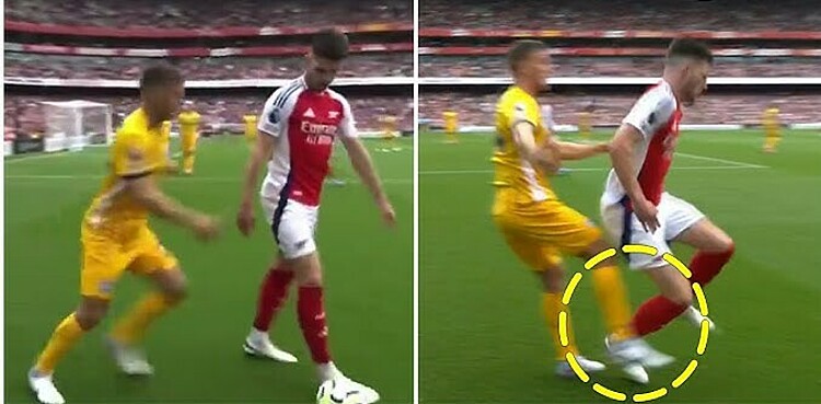 Phút 48 trận đấu trên sân Emirates ngày 31/8,khi Arsenal đang dẫn 1-0,Rice đi bóng không thành công ở sát cột cờ góc và phạm lỗi với Joel Veltman. Hậu vệ Brighton lập tức đứng dậy,có vẻ như định đá phạt nhanh. Nhưng Rice quay sang gẩy bóng đi và lãnh trọn cú sút của Veltman vào ống đồng.