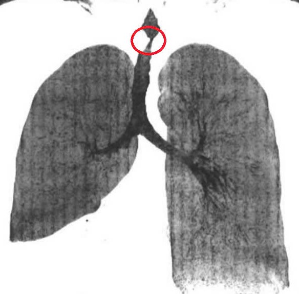 Chị Mai,36 tuổi,mắc bệnh lao phổi 4 năm trước,uống thuốc 6 tháng thì khỏi. Ba năm sau,chị bị hẹp khí quản do di chứng lao phổi. Sau điều trị bệnh lao,mô sẹo xơ phát triển vào trong lòng khí quản gây hẹp đường thở tăng dần. Đoạn hẹp dài 3 cm,chỗ hẹp nhất là 3x8 mm như sợi chỉ,trong khi đường kính khí quản người lớn khoảng 12 mm.