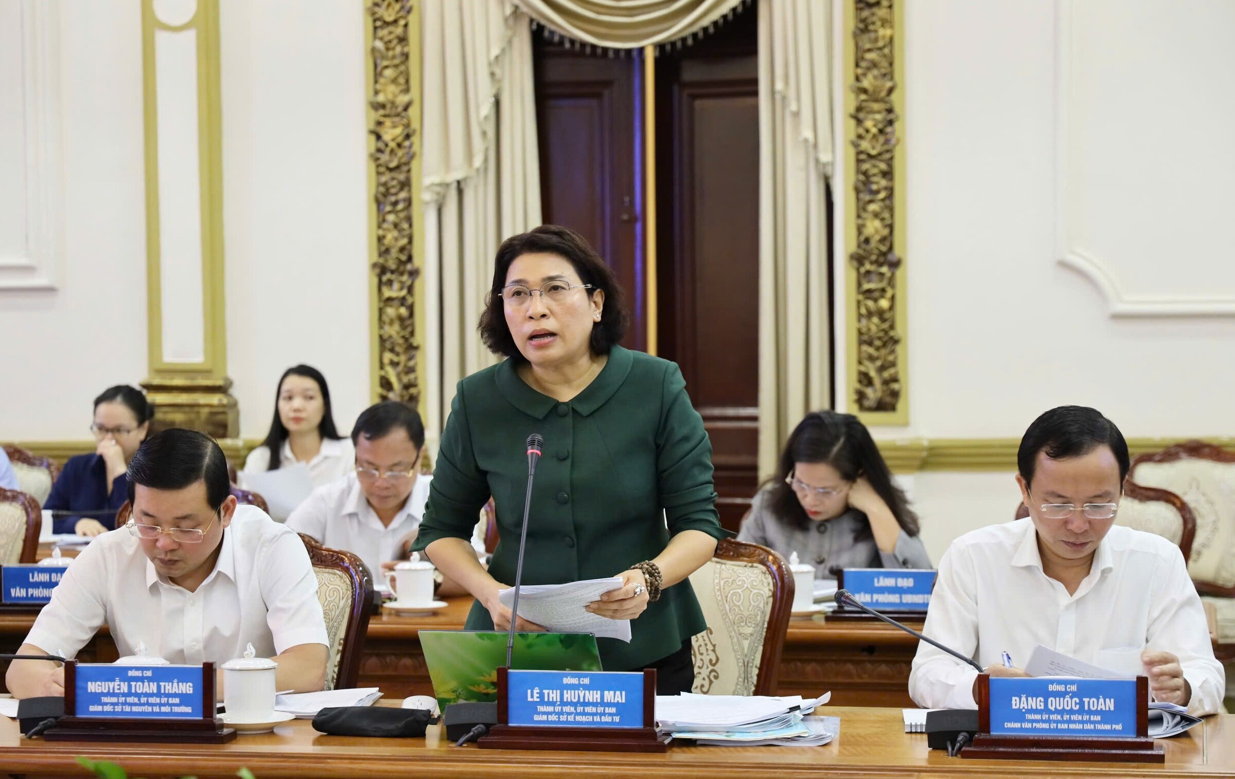 Giám đốc Sở Kế hoạch và Đầu tư TP HCM Lê Thị Huỳnh Mai và lãnh đạo các sở,ngành tại cuộc họp,sáng 4/9. Ảnh: Trung tâm báo chí TP HCM
