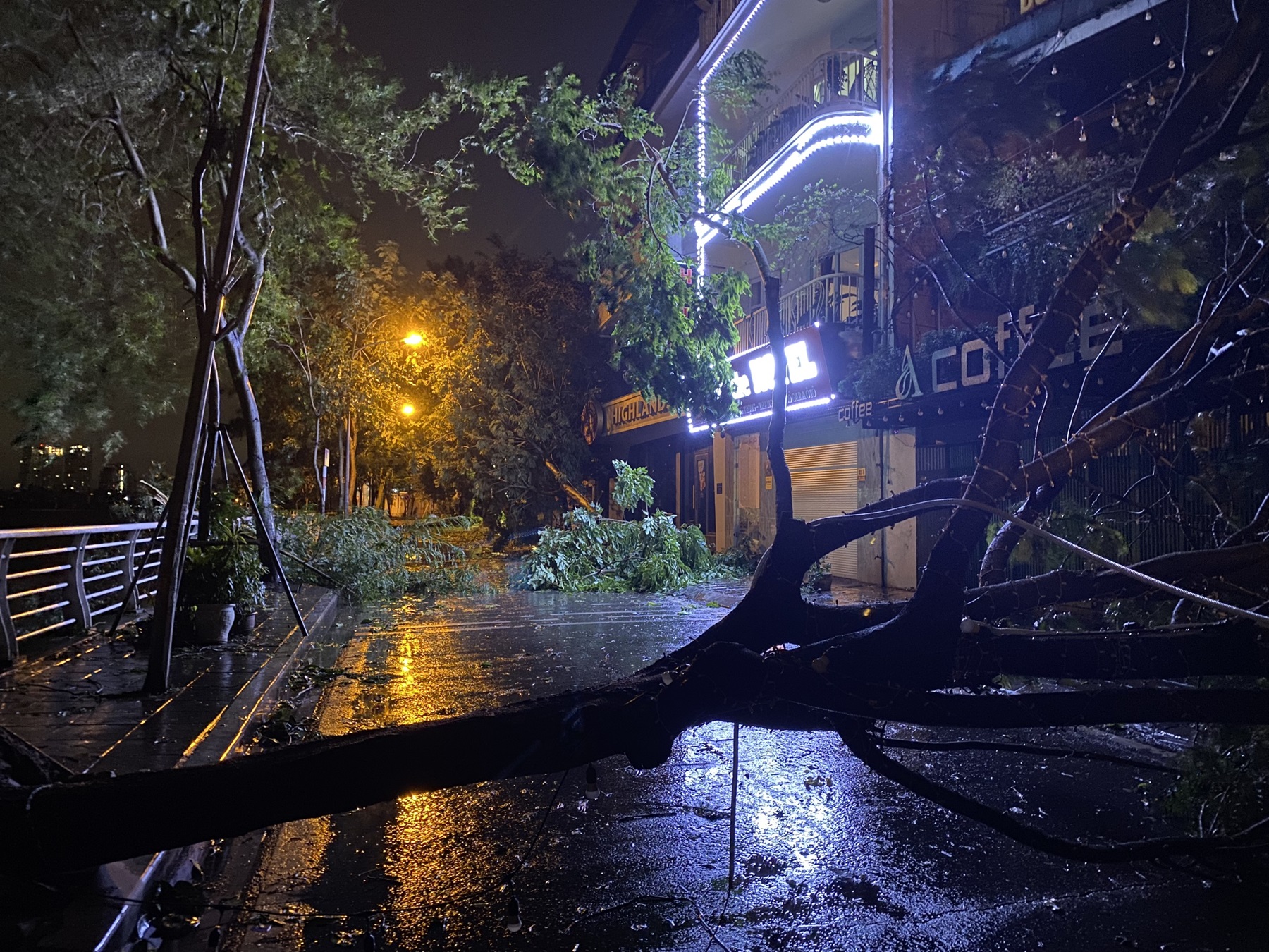 Cây đổ gãy trên phố Trích Sài lúc 2h sáng 8/9. Ảnh: Trần Duy Tiệp
