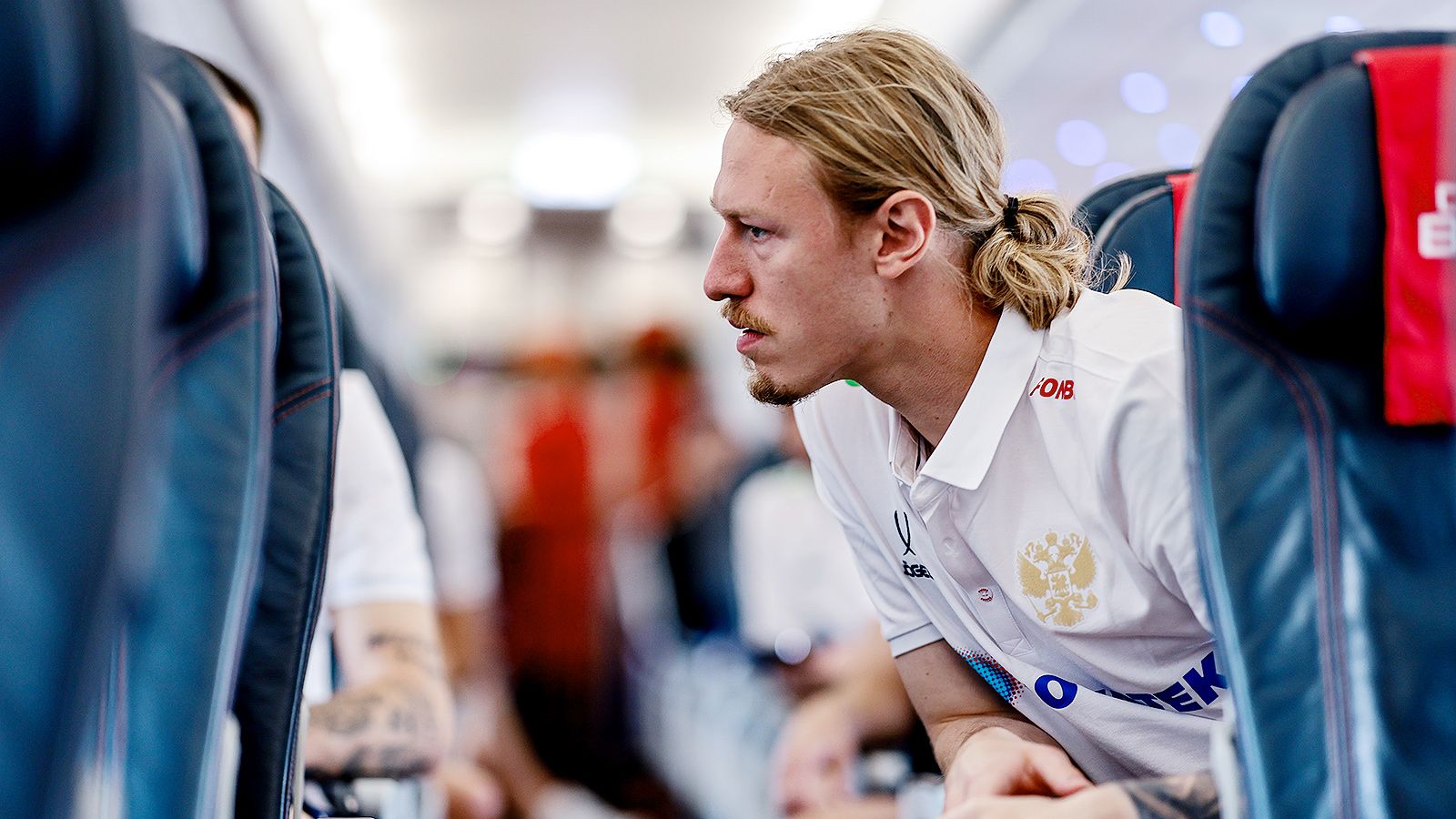 Thủ môn Matvey Safonov trên chuyên cơ chở đội tuyển Nga về nước,rạng sáng 8/9. Ảnh: Team Russia
