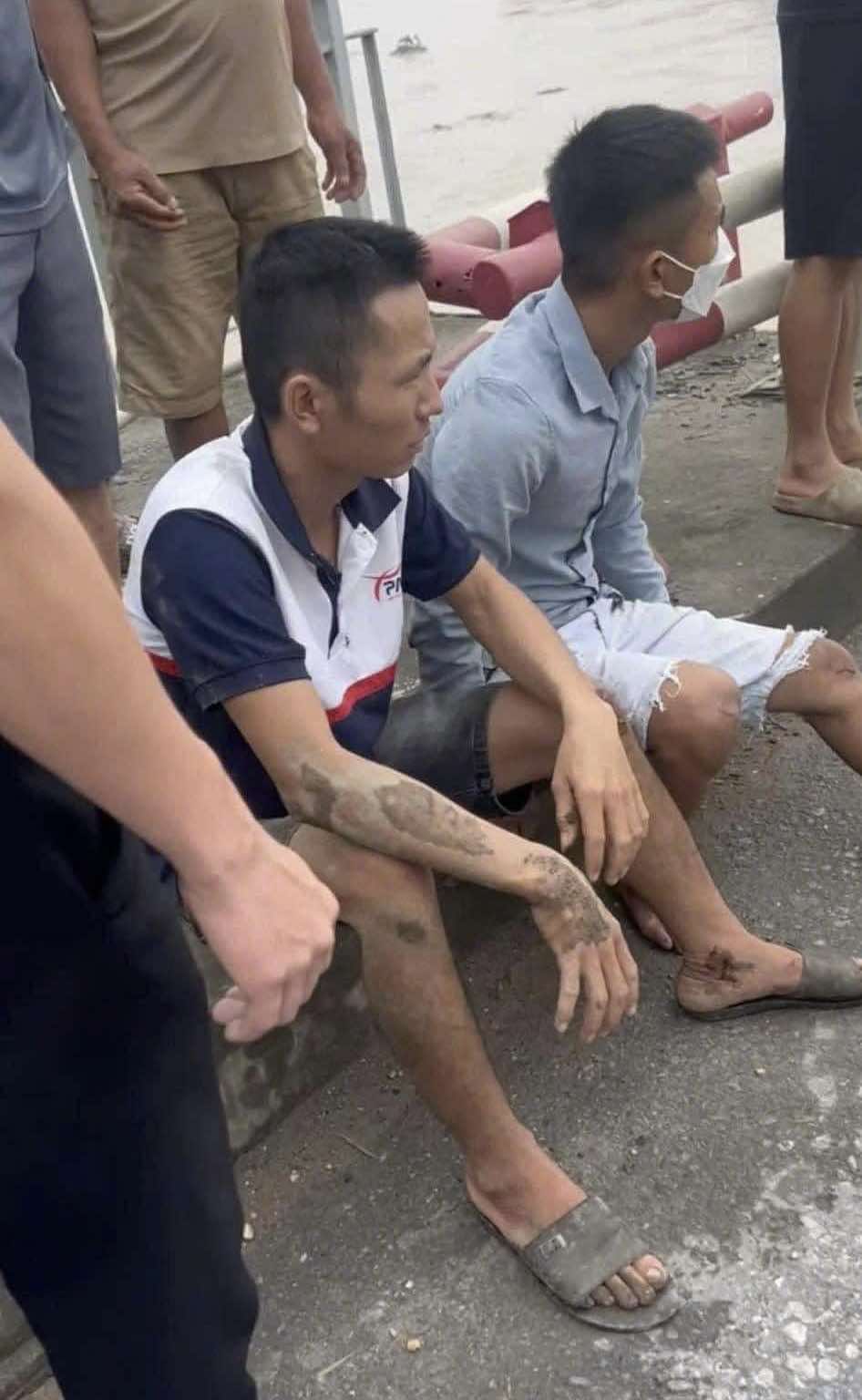 Minh Hải (phải) và Quý Trọng (trái) vẫn chưa hoàn hồn sau khi được dân cứu từ dưới chân cầu lên bờ sau sự cố sập cầu,9/9/2024. Ảnh: NC