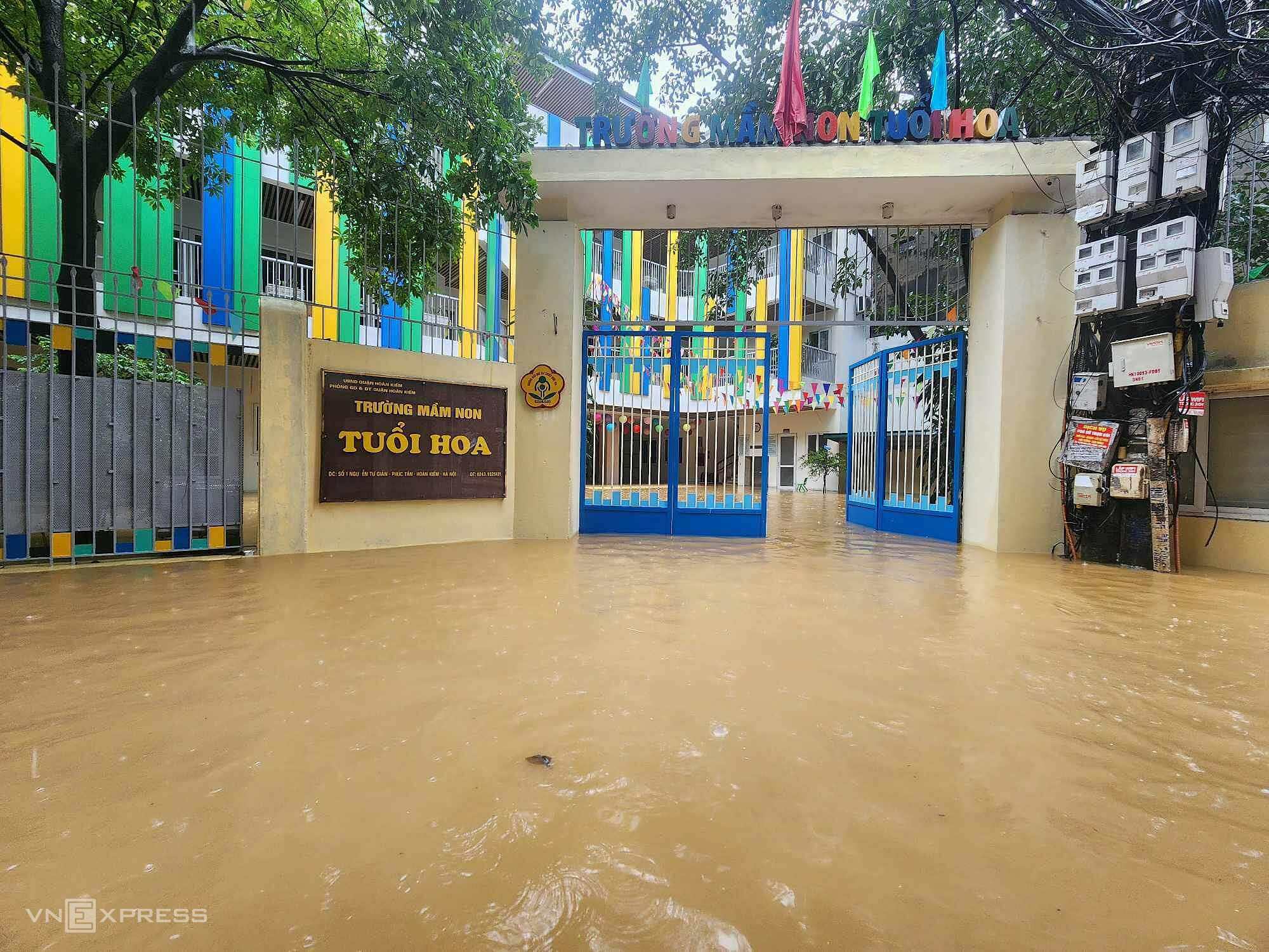 Tại trường Mầm non Tuổi Hoa,số 1 Nguyễn Tự Giản,phường Phúc Tân,Hoàn Kiếm,nước ngập vào sân nửa mét,trẻ nghỉ học từ ngày 11/9. Ảnh: Nguyễn Đông