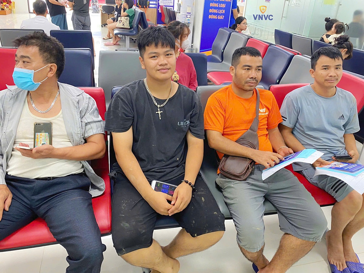 Phùng Hiếu (áo đen) và người thân bị thương trong khi dọn nhà,được tiêm vaccine uốn ván miễn phí tại VNVC Yên Bái sáng 13/9. Ảnh: Nguyễn Ngân