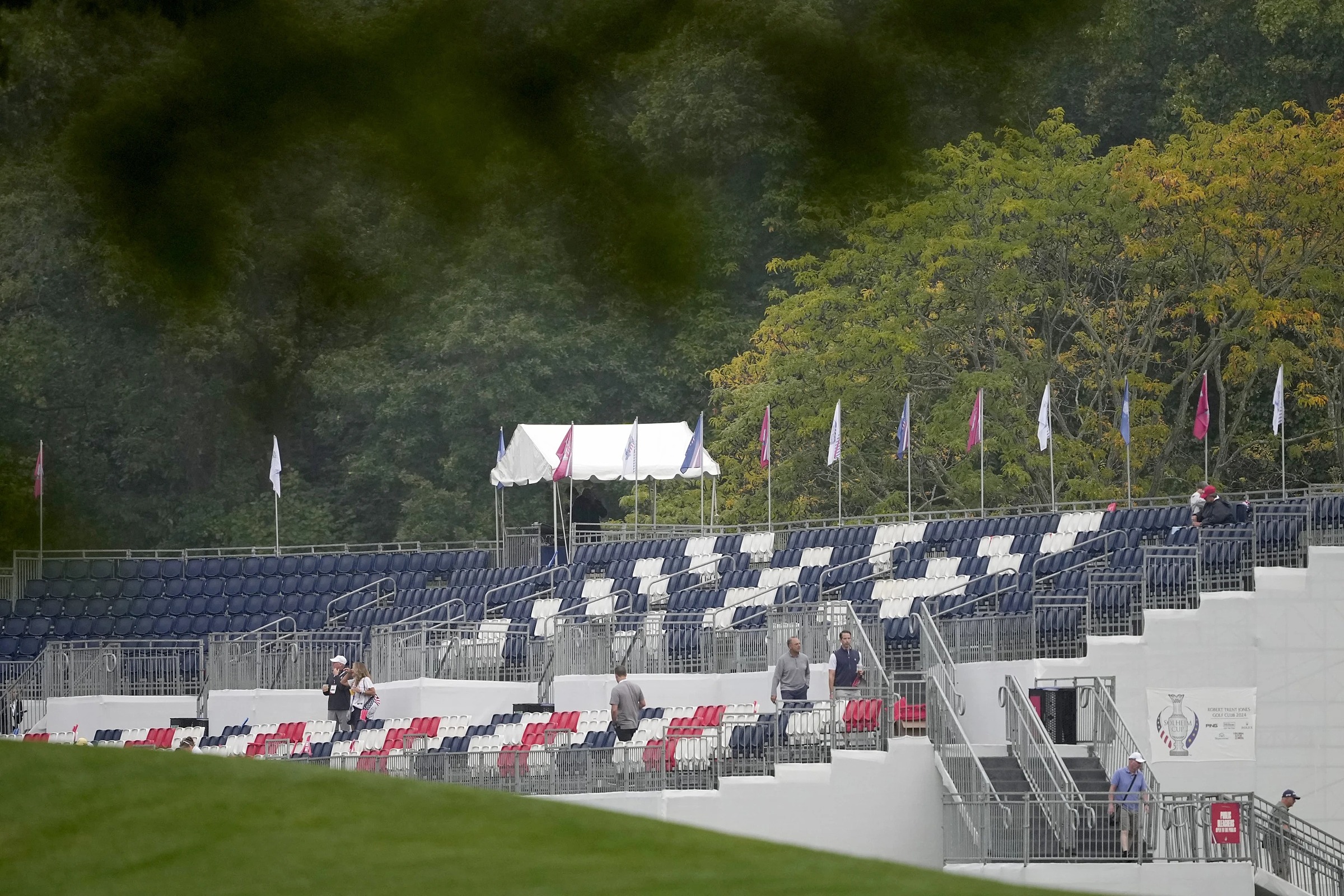 Khán đài trống ở khi các golfer vào đấu hố đầu trận mở màn vào sáng 13/9. Ảnh: AP