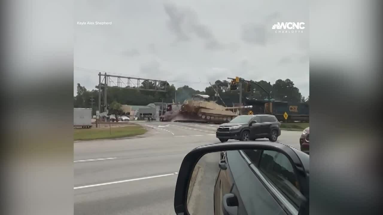 Đoàn tàu húc trúng xe đầu kéo chở pháo tự hành M109 Paladin ngày 12/9. Video: WCNC