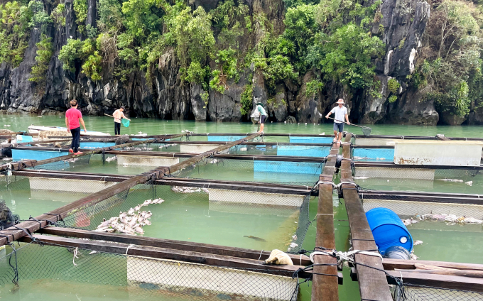 Gia đình ông Phạm Văn Dương,ở Vân Đồn đang vớt những con cá chết bỏ đi và gom lại cá sống,hôm 10/9. Ảnh: Phan Dương