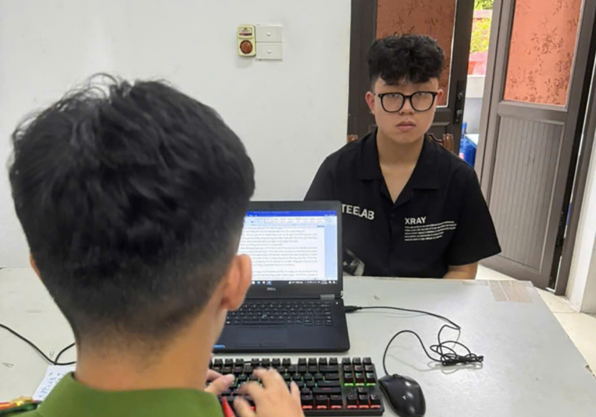 Phạm Hồng Thắng (áo đen) tại cơ quan điều tra. Ảnh: Công an cung cấp