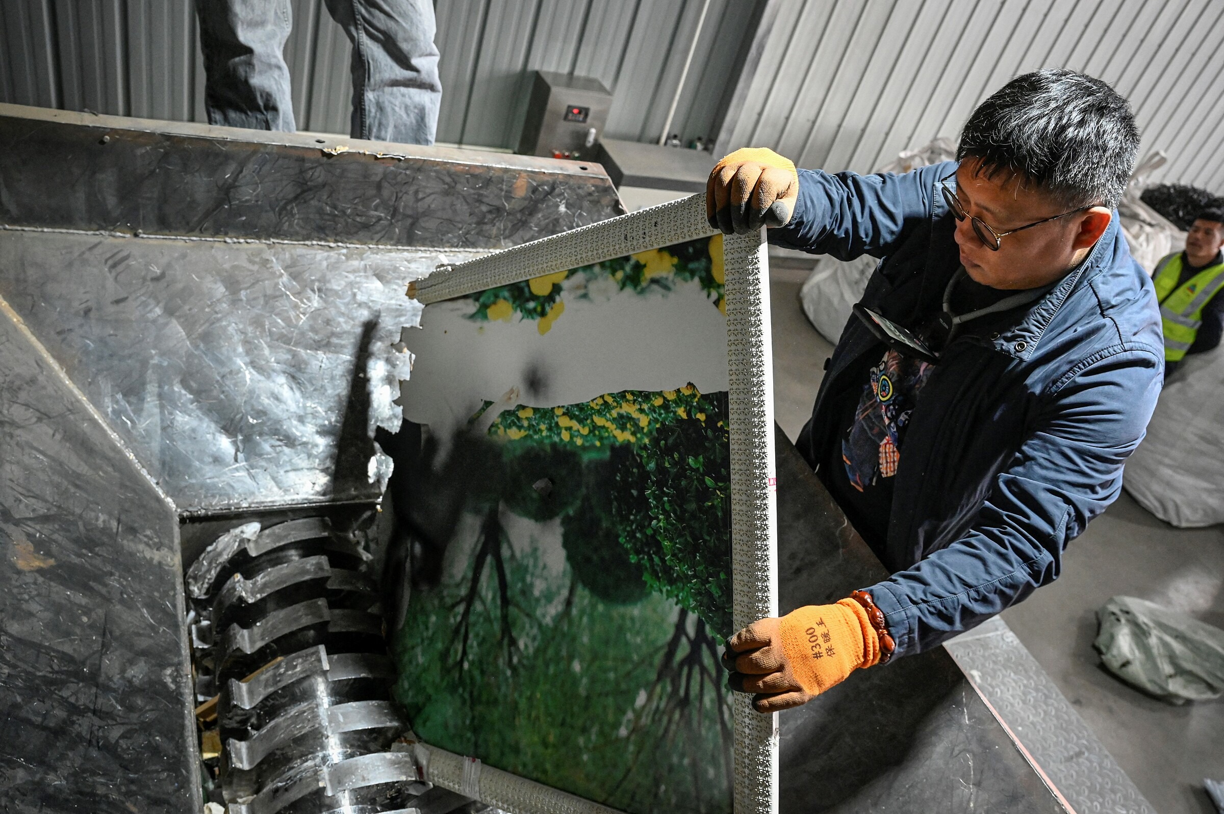 Nhân viên của Liu Wei cho tấm ảnh cưới cỡ lớn vào máy nghiền trong nhà kho ở Lang Phường,tỉnh Hà Bắc,ngày 27/3. Ảnh: AFP
