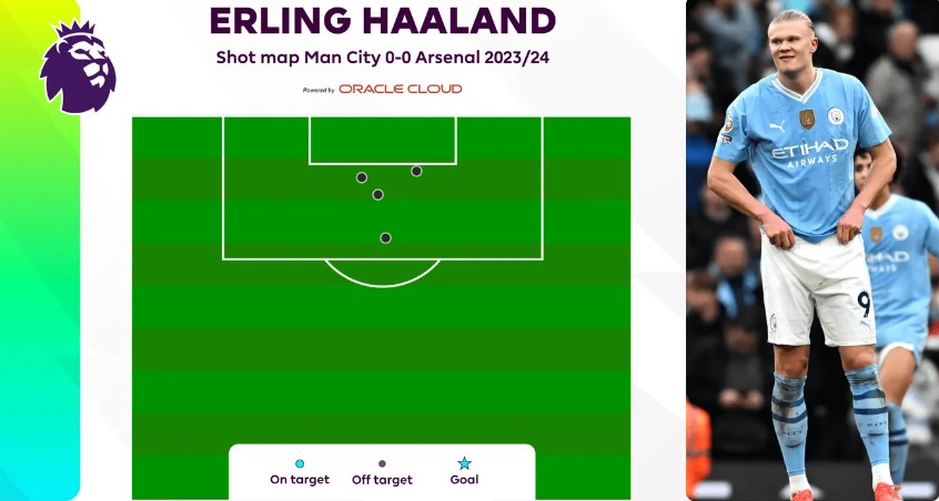 Bốn lần dứt điểm không trúng đích của Haaland trong trận Man City hòa Arsenal 0-0 trên sân Etihad,Manchester,Anh ngày 31/3/2024
