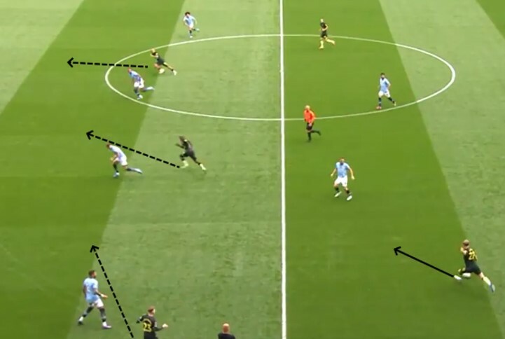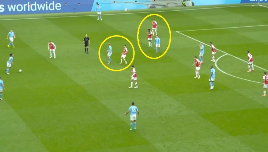 Trong ví dụ điển hình dưới đây,từ trận hòa trên sân Etihad,hai ngòi nổ Kevin De Bruyne và Phil Foden (khoanh tròn) cùng bị theo kèm sát. Điều đó buộc Man City phải luân chuyển qua lại để kéo giãn hàng thủ đội khách,dẫn đến việc giảm nhịp độ trận đấu.