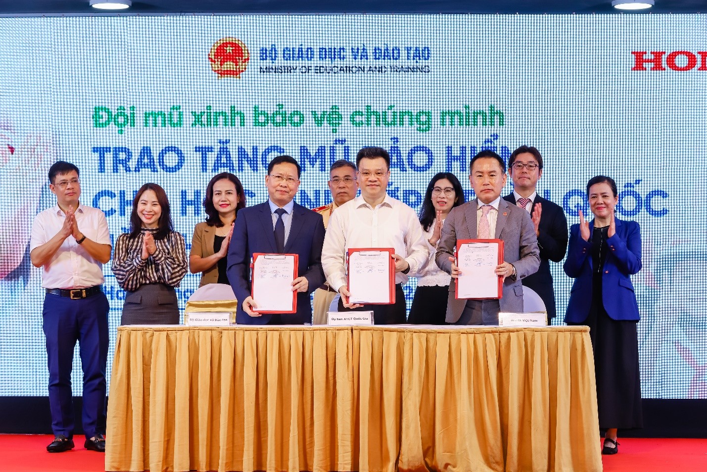 Từ trái qua,đại diện Bộ Giáo dục và Đào tạo,Ủy ban ATGT Quốc gia và Honda Việt Nam (hàng đầu) tại buổi lễ. Ảnh: HVN