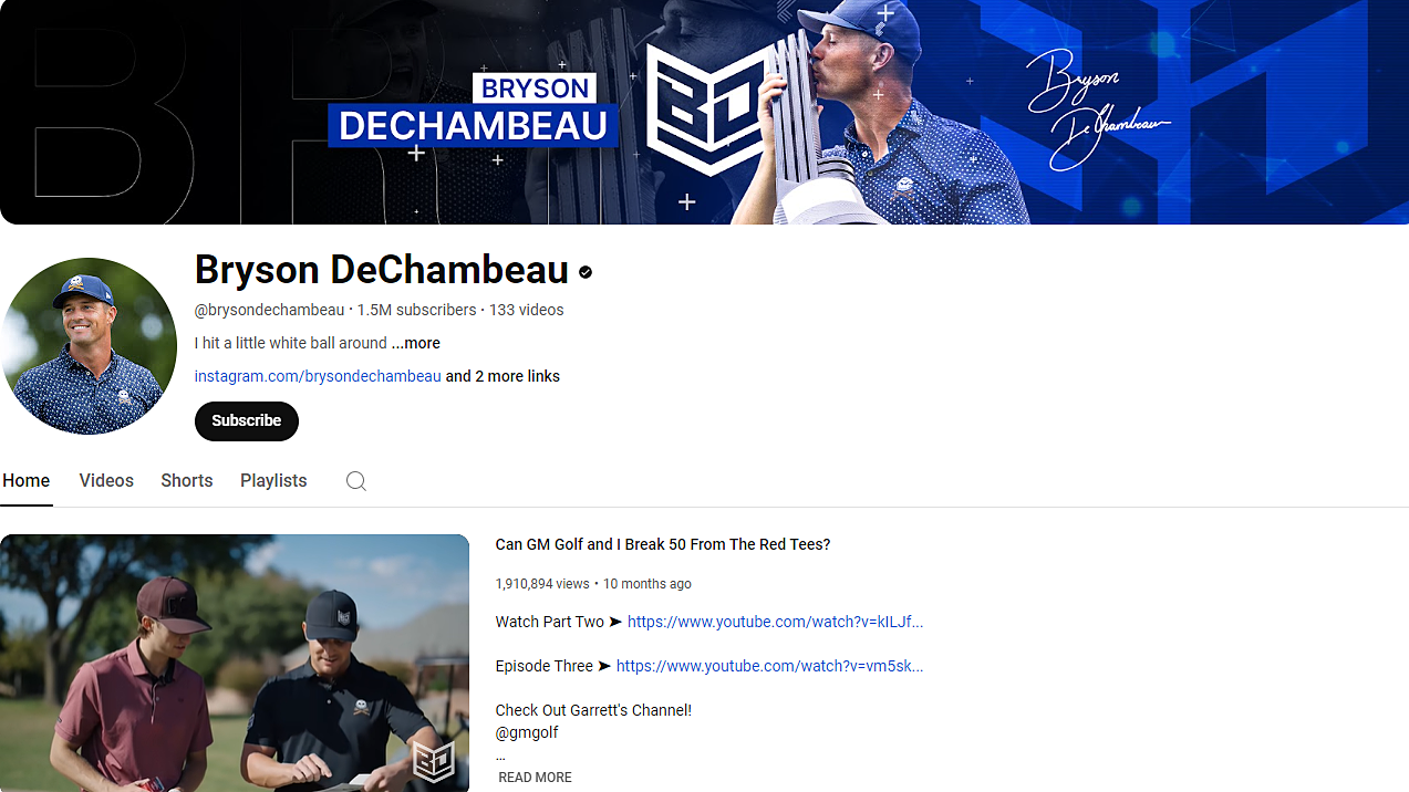 DeChambeau đang hơn PGA Tour về mức độ quan tâm nhưng thua xa về chỉ số xem nội dung. Hiện tại,lượt view kênh DeChambeau ở mức 189,3 triệu,còn PGA Tour xấp xỉ 1,738 tỷ. Chênh lệch này chủ yếu do thâm niên hoạt động,quy mô sản xuất nội dung. DeChambeau xuất hiện trên YouTube từ 20/11/2012,đến nay tung lên 133 video trong khi PGA Tour từ 1/8/2006 với tổng cộng 20.607 video.