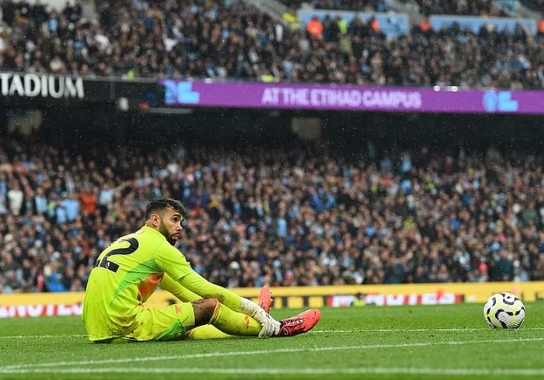 Thủ môn David Raya ngồi bệt xuống sân sau khi nói chuyện với Myles Lewis-Skelly ở hiệp hai trận Arsenal hòa 2-2 trên sân Man City tại vòng năm Ngoại hạng Anh. Ảnh: EPA