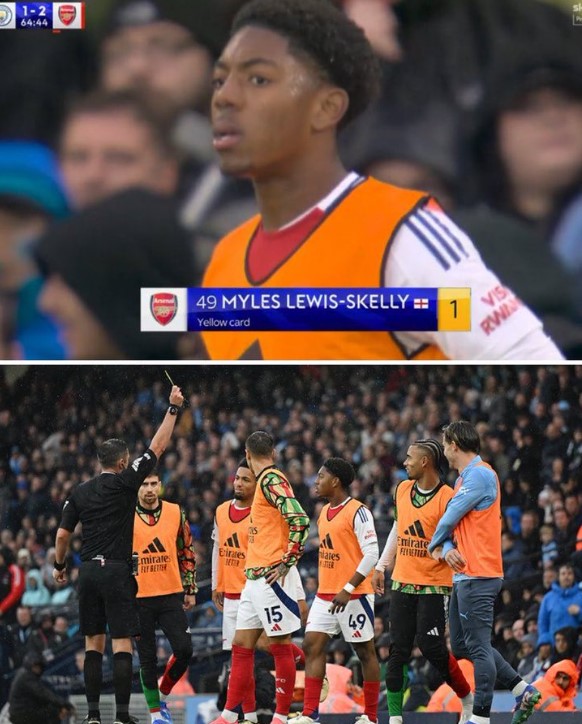 Trọng tài chính Michael Oliver phát hiện Lewis-Skelly nói chuyện trái phép với Raya,và rút thẻ vàng cảnh cáo khi tiền vệ 17 tuổi trở về đường biên dọc - khu vực quy định khởi động.