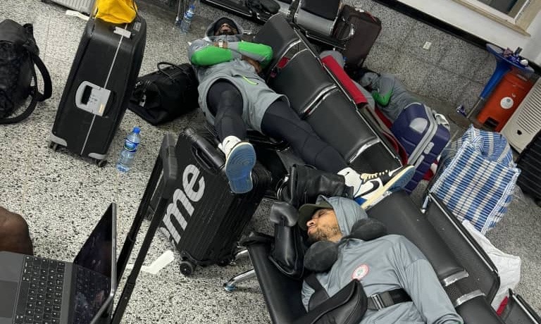 Các cầu thủ Nigeria phải nằm vạ vật ở sân bay Al Abraq. Ảnh: X / William Troost-Ekong
