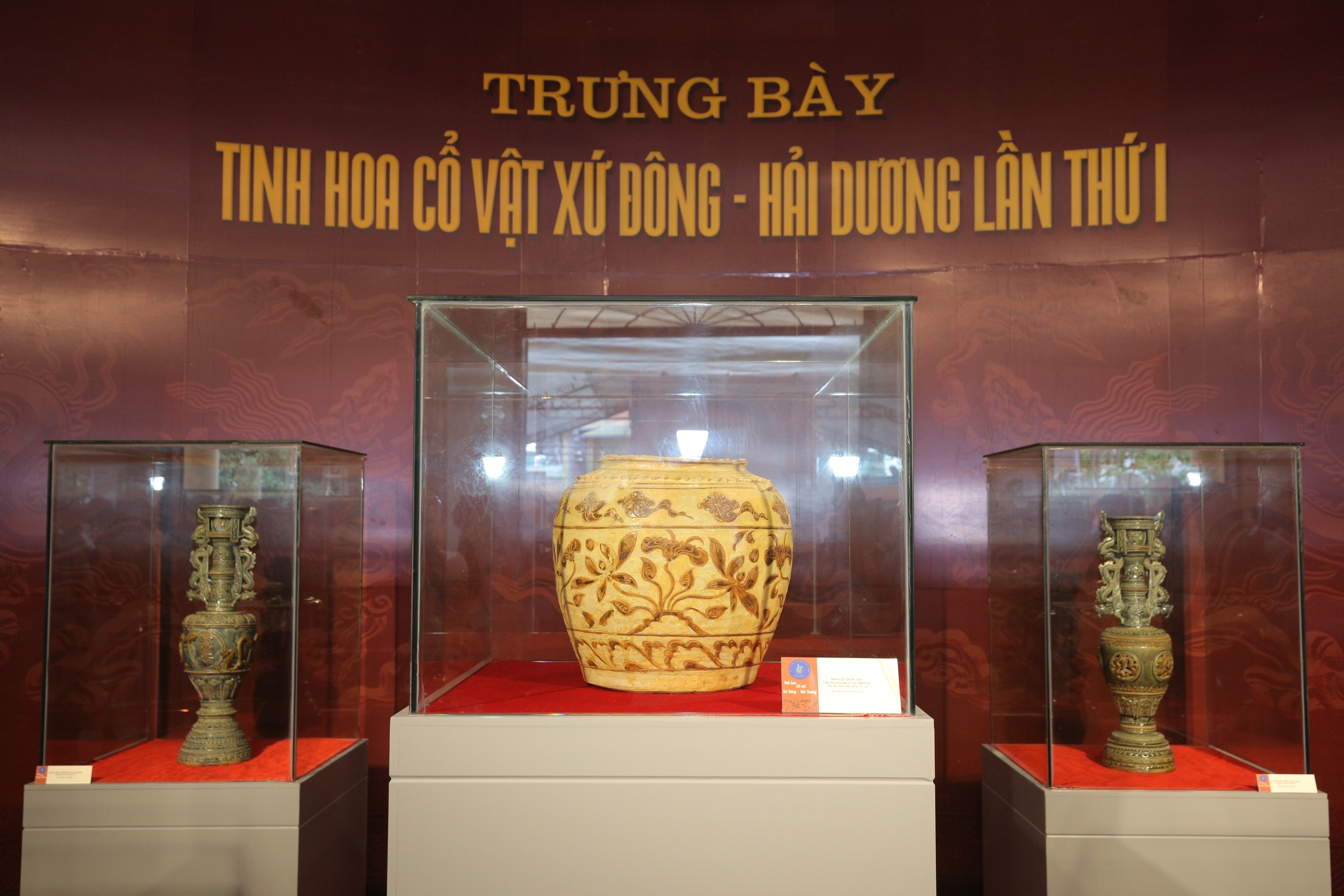 Các cổ vật được trưng bày theo chuyên đề "Tinh hoa cổ vật Xứ Đông - Hải Dương lần thứ nhất" nhân dịp tỉnh Hải Dương công bố quyết định của Thủ tướng công nhận bảo vật quốc gia chum gốm hoa nâu Hiệp An thời Trần ngày 19/10.