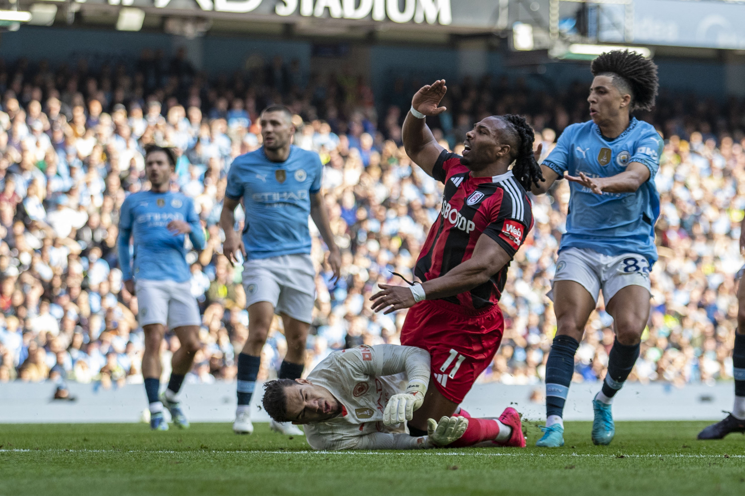 Thủ môn Ederson cản một cú sút của Adama Traore trong trận Man City thắng Fulham 3-2 ở vòng 7 Ngoại hạng Anh trên sân Etihad ngày 5/10. Ảnh: AFP.