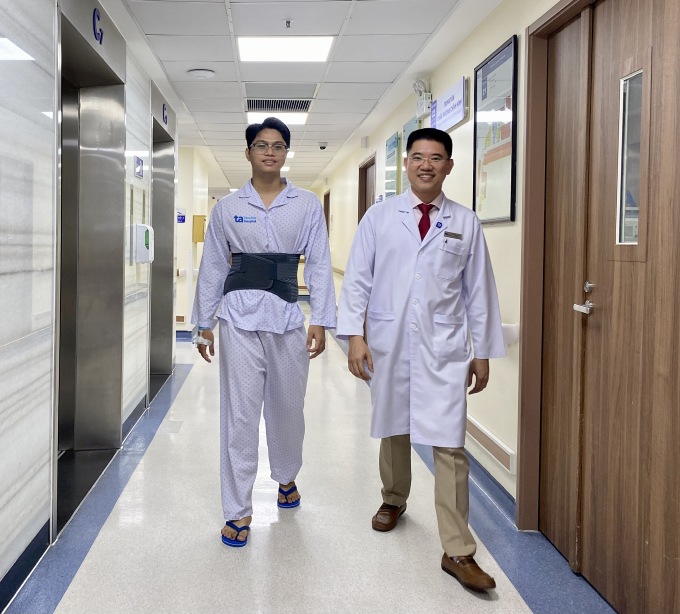 Bác sĩ Xuân Anh và anh Tân tập đi lại trước khi xuất viện. Ảnh: Bệnh viện Đa khoa Tâm Anh