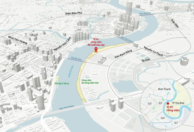 Vị trí được đề xuất cải tạo giáp công viên bờ sông hiện hữu. Đồ họa: Đăng Hiếu
