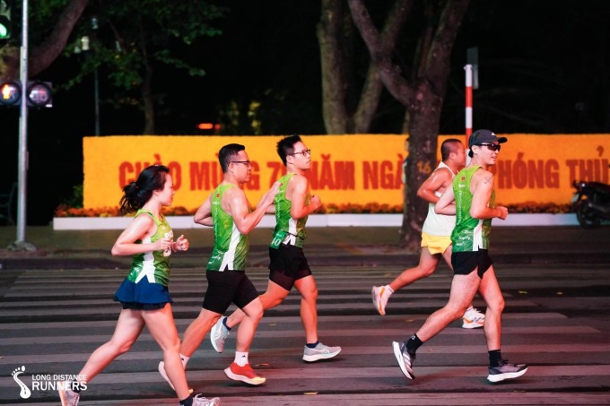 Một nhóm runner chạy tập theo pace 5:40 - tốc độ cần thiết để đạt mục tiêu sub4 marathon - tại Hồ Gươm,Hà Nội. Ảnh: Long Distance Runners