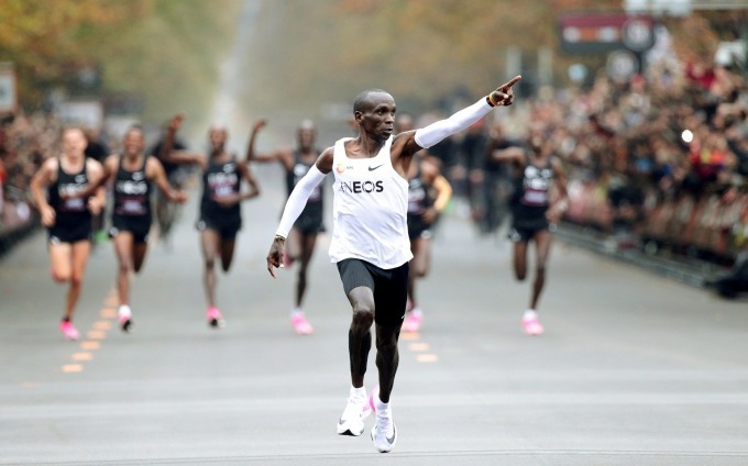 Huyền thoại Eliud Kipchoge chinh phục thành công thử thách chạy marathon sub2 tại Vienna,Áo năm 2019 bằng đôi siêu giày Nike Vaporfly. Ảnh: INEOS