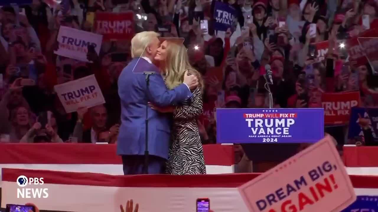Vợ chồng ứng viên tổng thống đảng Cộng hòa Donald Trump ôm hôn nhau trên sân khấu sự kiện vận động tranh cử ở thành phố New York ngày 27/10. Video: PBS News