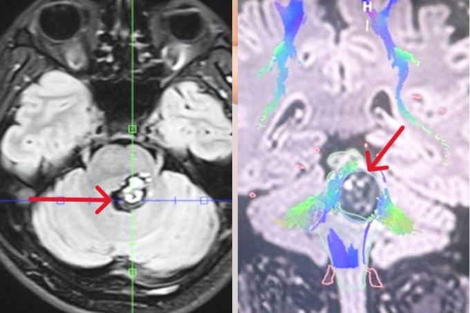 Khối u đã được phát hiện từ 6 năm trước,bác sĩ đánh giá khó mổ,anh Bạch điều trị bằng xạ phẫu Gamma Knife. Gần một năm nay triệu chứng ngày càng nặng hơn,anh uống thuốc giảm đau không bớt. Kết quả chụp MRI 3 Tesla sọ não kết hợp chụp bó sợi thần kinh (DTI) tại Bệnh viện Tâm Anh ghi nhận khối u kích thước 1,5 cm,nằm trong thân não.