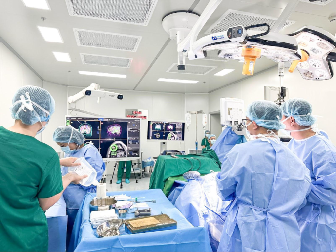 Êkíp sử dụng robot mổ não phẫu thuật cho anh Bạch. Ảnh: Bệnh viện Đa khoa Tâm Anh