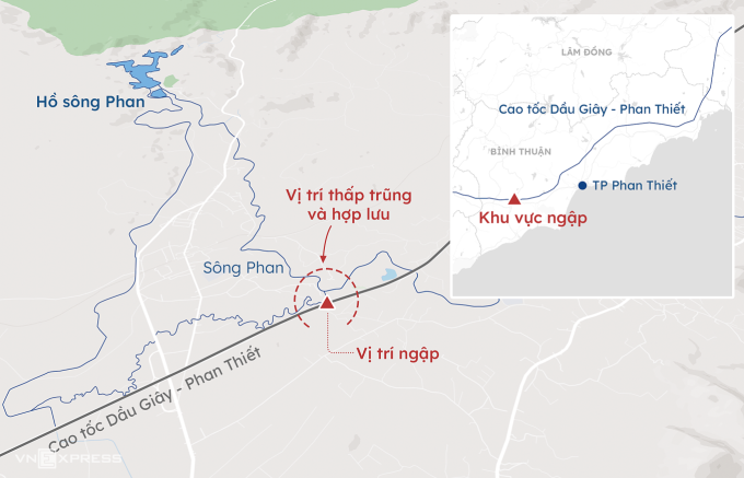 Vị trí xảy ra ngập trên cao tốc hồi tháng 7. Đồ họa: Khánh Hoàng