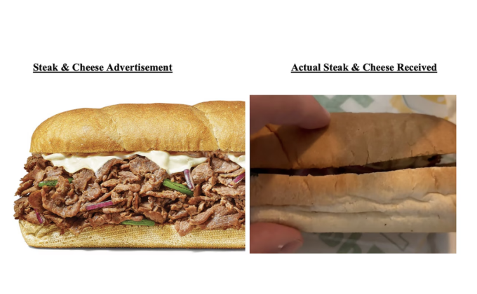 Nguyên đơn cáo buộc Subway sử dụng "các bức ảnh trong quảng cáo khiến người ta có cảm giác rằng bánh sandwich bít tết & phô mai chứa nhiều thịt gấp 3 lần so với bánh sandwich thực tế mà khách nhận được".