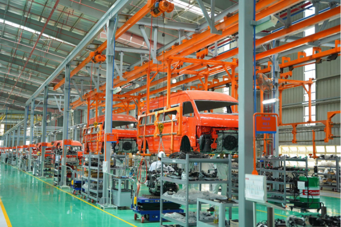 Một dây chuyền lắp ráp dòng minibus X9 tại nhà máy Kim Long Motor Huế. Ảnh: Kim Long Motor