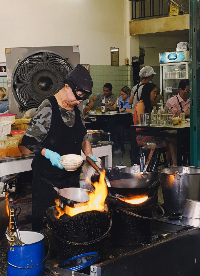 Bà chủ Jay Fai,81 tuổi,được xem là huyền thoại của ẩm thực đường phố Thái Lan khi đã đưa các món ăn bình dân lên tầm cao. Jay Fai là người đứng bếp chính,luôn xuất hiện trong diện mạo dễ nhận,đánh son đỏ sẫm,đeo kính bảo hộ và có một nốt ruồi lớn.