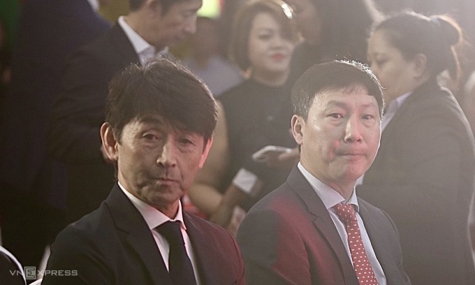 Tân HLV đội tuyển Việt Nam Kim Sang-sik (phải) và HLV tuyển Thái Lan,Masatada Ishii trong lễ bốc thăm ở Hà Nội chiều 21/5/2024. Ảnh:Hiếu Lương