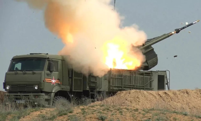 Tổ hợp pháo - tên lửa phòng không Pantsir-S1 khai hỏa trong cuộc diễn tập ở vùng Astrakhan tại Nga năm 2020. Ảnh: RIA Novosti
