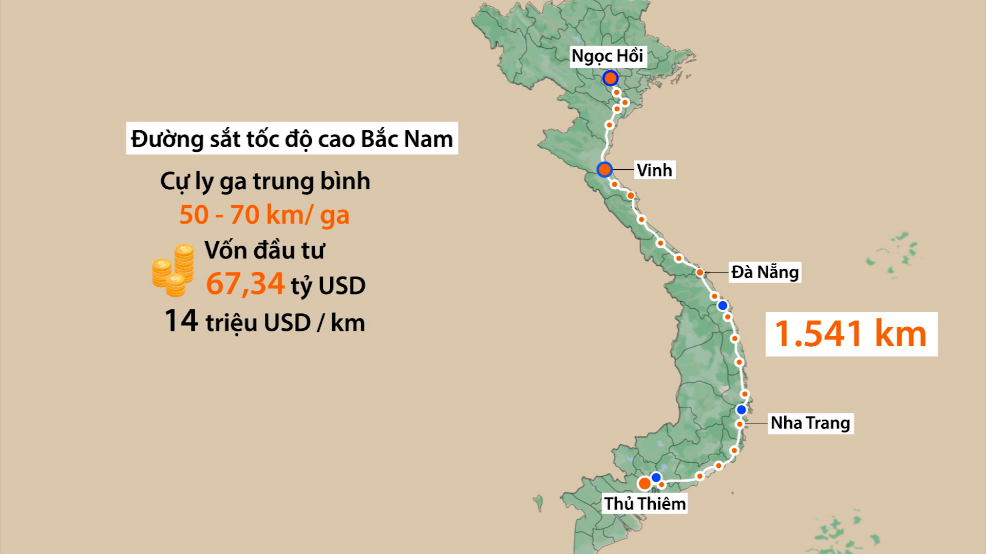 Dự kiến hướng tuyến và 23 ga hành khách của đường sắt tốc độ cao Bắc Nam. Đồ họa: Đăng Hiếu