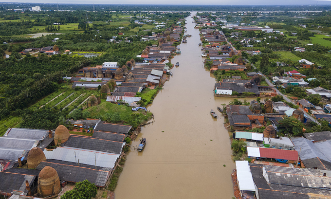 Hàng trăm lò sản xuất gạch,gốm đỏ ven kênh Thầy Cai ở huyện Mang Thít. Ảnh: An Bình