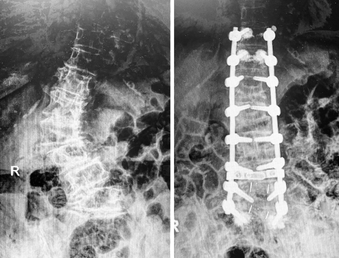 Hình chụp MRI cho thấy cột sống người bệnh cong như chữ C (trái) và thẳng lại sau phẫu thuật. Ảnh: Bệnh viện Đa khoa Tâm Anh