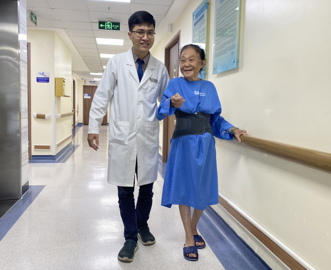 Bác sĩ Thắng hướng dẫn người bệnh đi lại trước khi xuất viện. Ảnh: Bệnh viện Đa khoa Tâm Anh